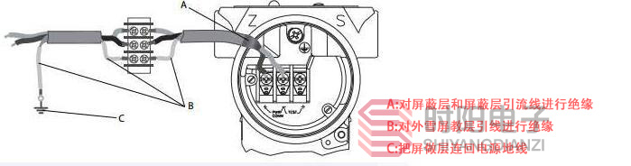 4. 确保正确接地。仪表电缆屏蔽层必须: